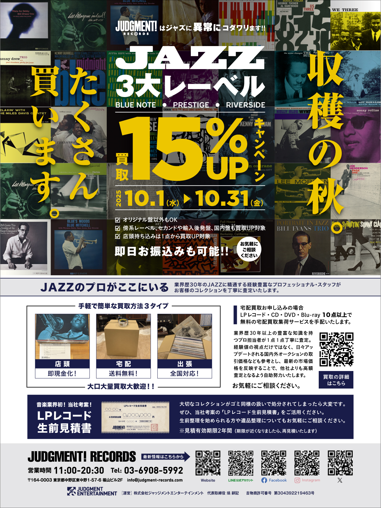 3大レーベル「BLUE NOTE」「PRESTIGE」「RIVERSIDE」買取15%UPキャンペーン!!